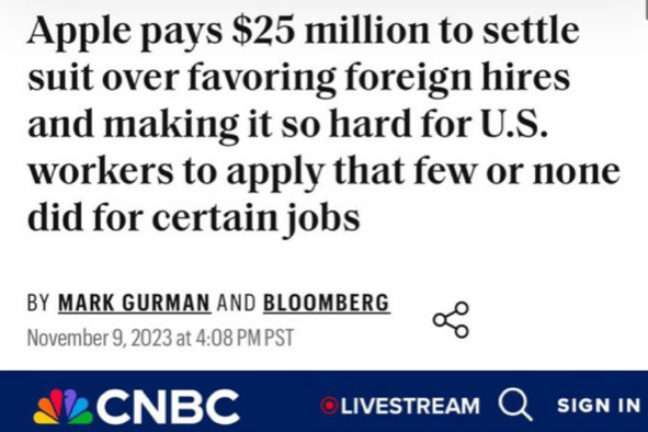 This inspired people to dig into the H1b visa program since a lot of the visas issued are within the public domain. What was revealed was a long list of fraud, discriminatory hiring, and deceptive practices. For example, it was found that several big companies such as Google and Apple settled multi million dollar settlements acknowledging they discriminated against American workers by undercutting them to hire cheaper foreign nationals from countries they preferred, mainly India, a country known for poor working conditions and subservient workers who do not fight labor abuses. Furthermore, it seems over 70% of H1b visas have been allocated to India at a disproportionate rate in comparison to other nations.