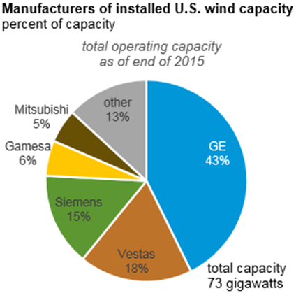 This meant that StrEG removed an important barrier to entry because it was StrEG that imposed the mandate to connect and purchase electricity. This stipulation meant that the process for energy generators was significantly simplified. Had that stipulation not existed monopolistic utilities would have likely resisted efforts by new entrants to connect with their networks. (Allen & Davies,2014, pg 937-938). The graph below shows the market share of wind turbine manufactures in Germany during 1998(top) and US market share in 2015 (bottom). Germany had about the same amount of manufactures the US has now: